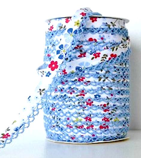 Blue red floral lace bias binding (double fold) PRICED PER METRE