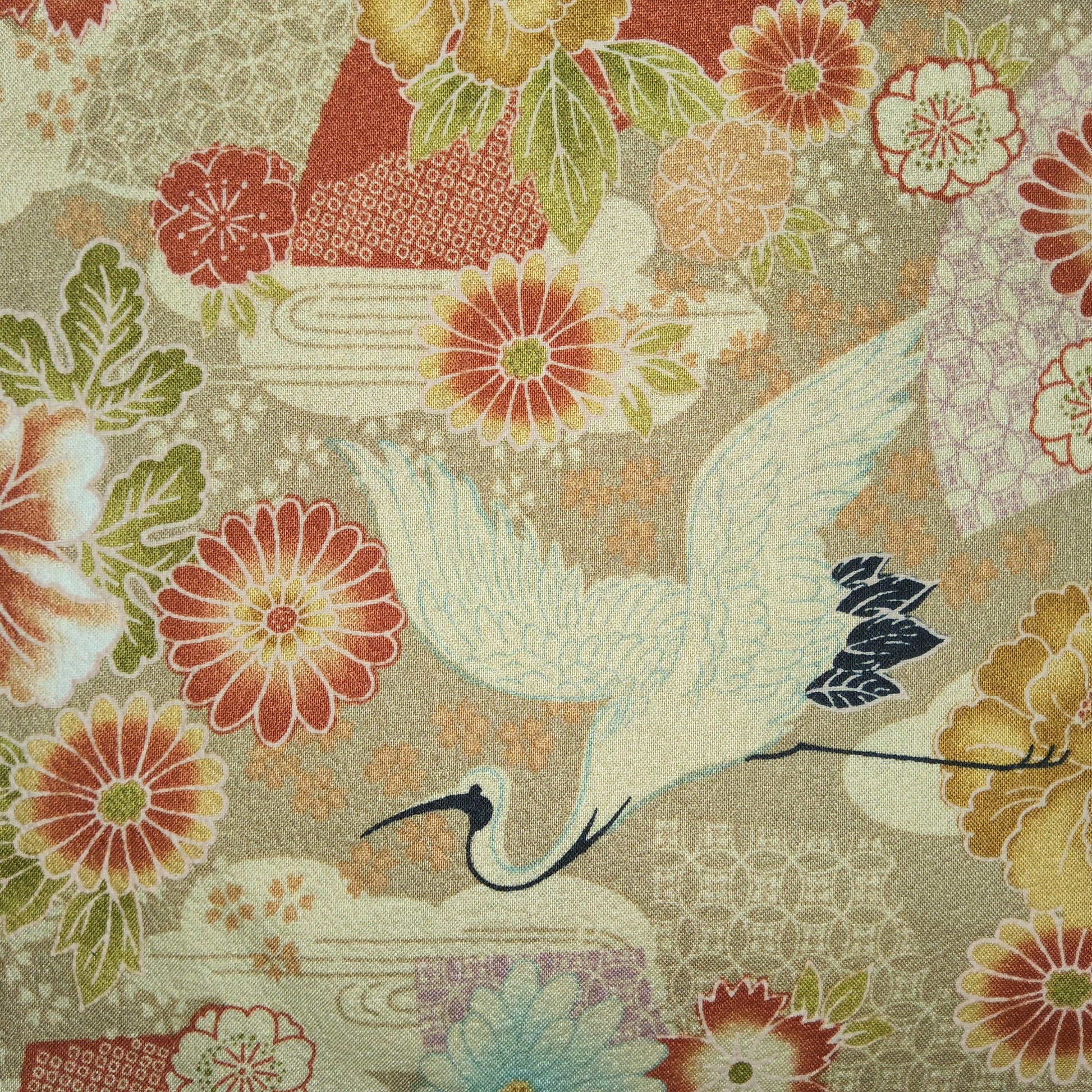Japanese cotton crepe fabric cranes and flowers beige *