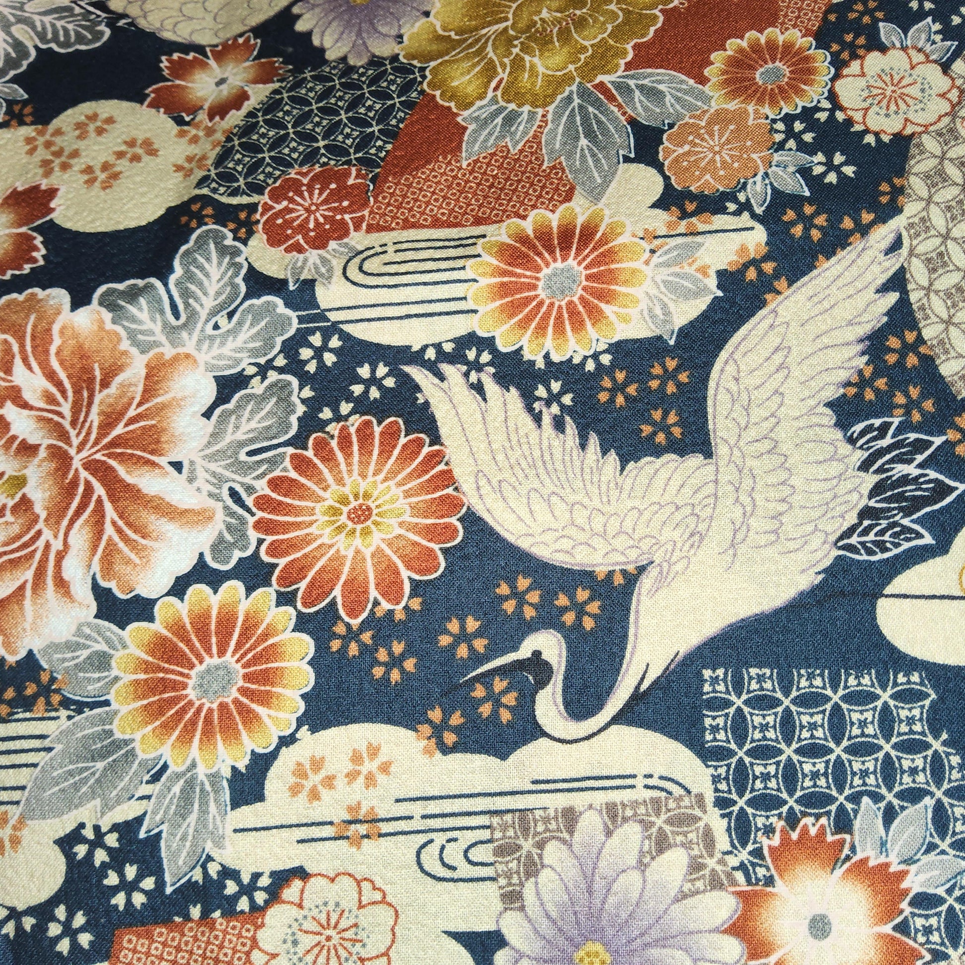 Japanese cotton crepe fabric navy cranes and flowers *