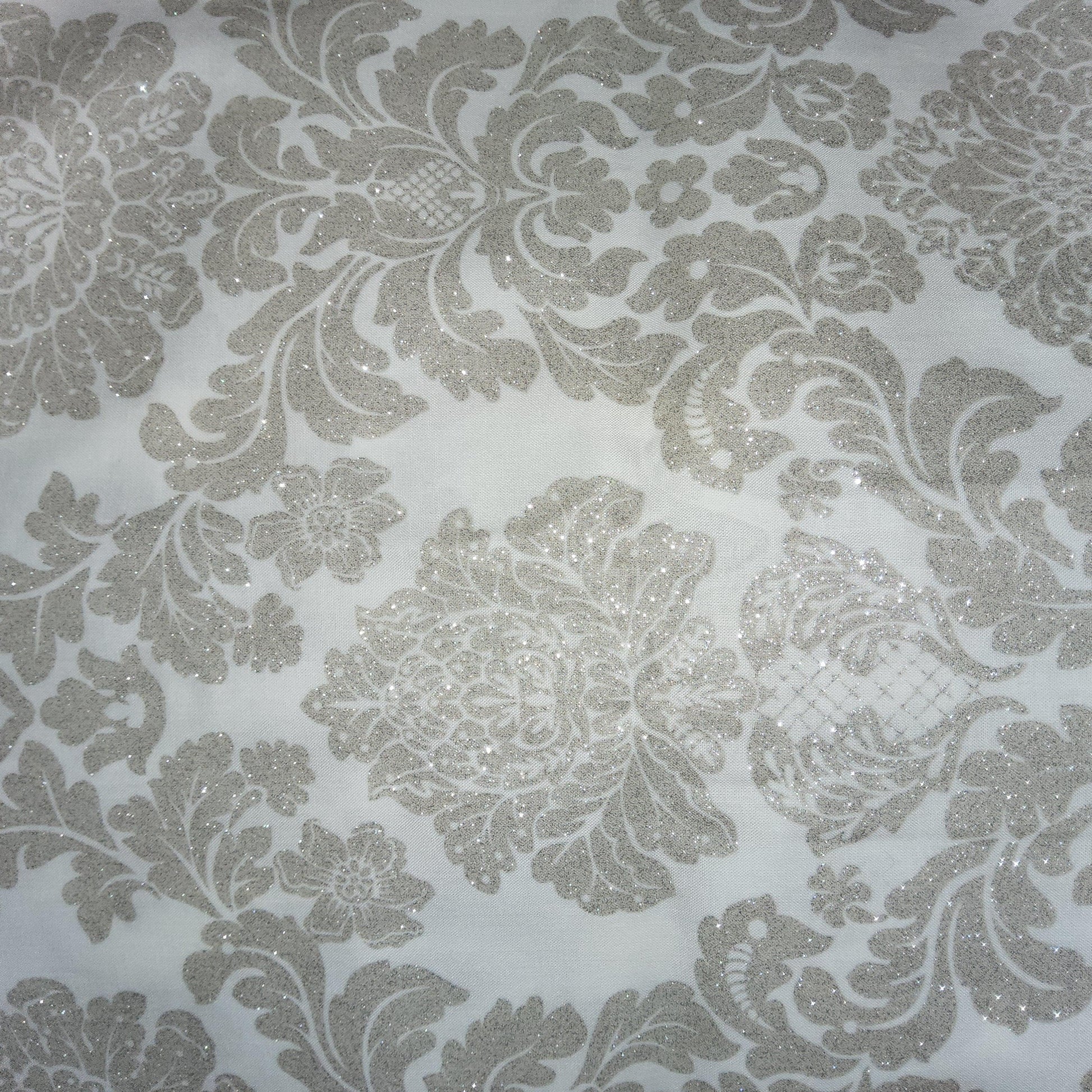 white background, glittery grey/silver damask print