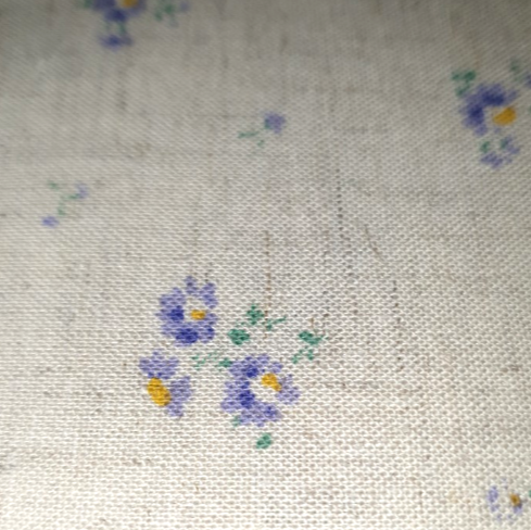 lightweight printed linen...natural/offwhite rustic background with small violet flowers with yellow centres. 1/4" flower heads