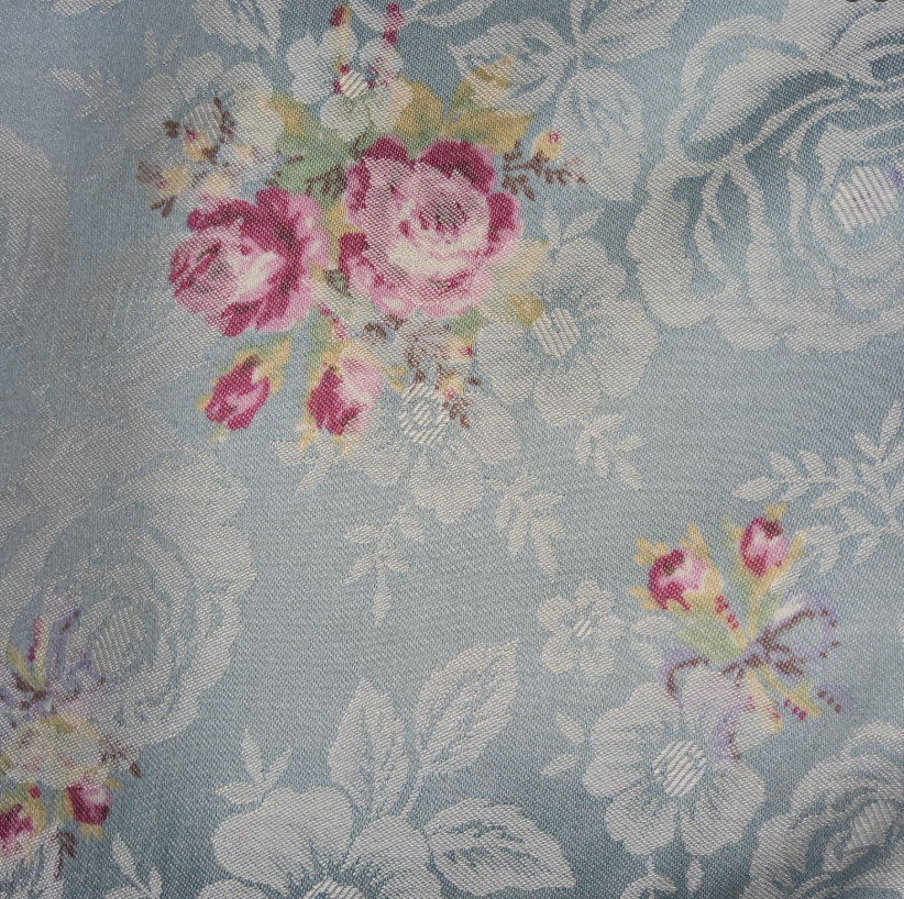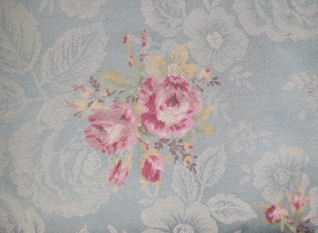 Heavier weight cotton with floral brocade woven print in background.